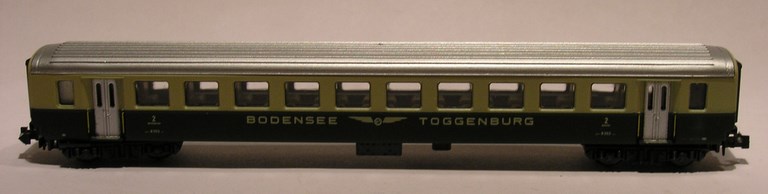 Description : wagon passagers 2ème classe vert-crème, compagnie BT (Bodensee-Toggenburg), en parfait état (neuf)